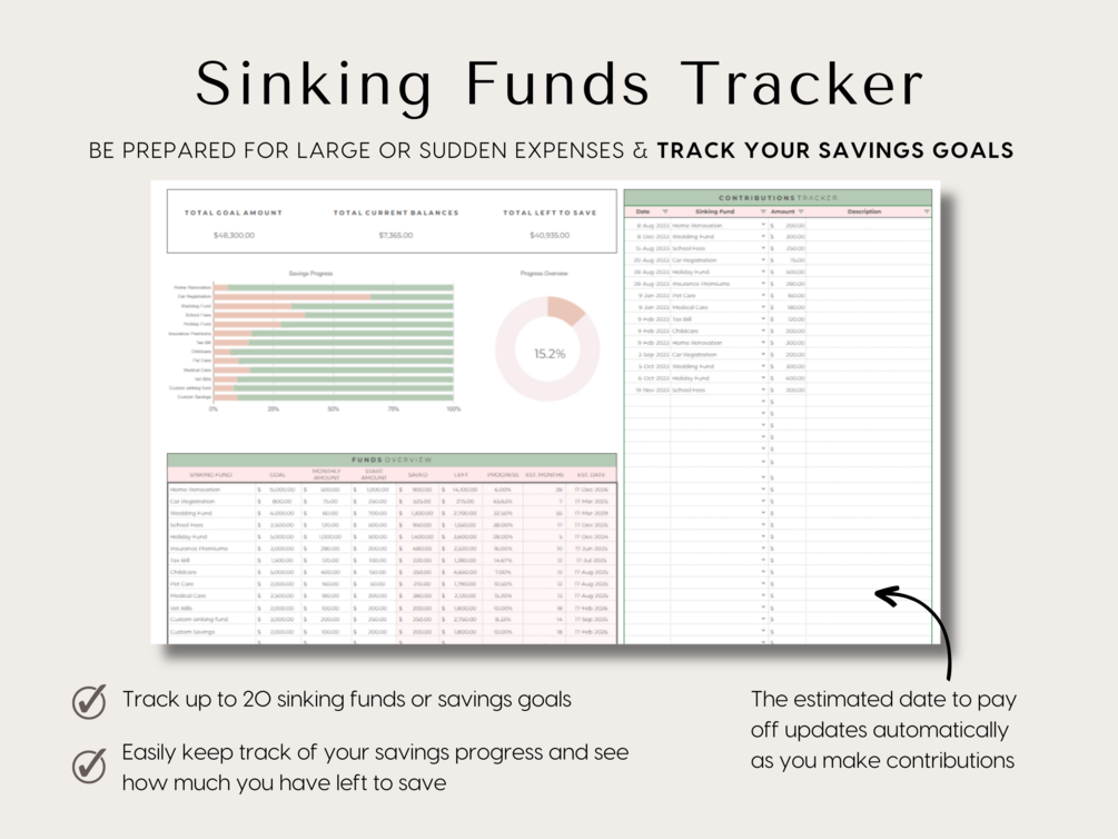 ● Sinking funds tracker to track up to 20 sinking/savings goals and easily see how much you have saved, and how much you have left to save.