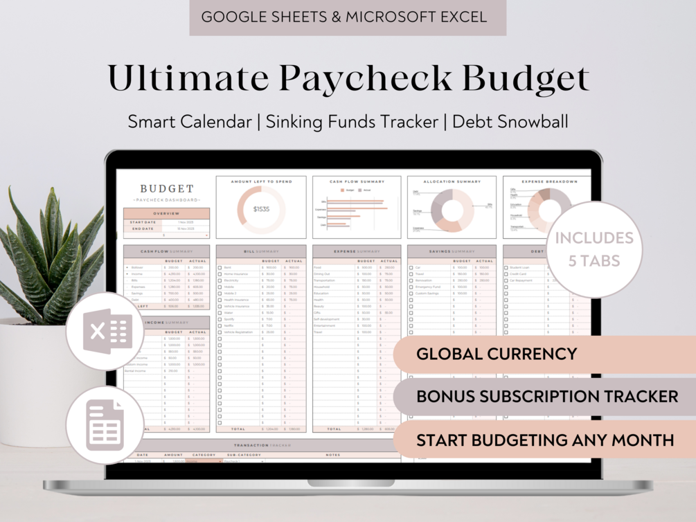 Get started on your financial journey with the Ultimate Paycheck Budget. This ultimate spreadsheet template includes everything you need to budget, track your spending, saving and debt and create a plan to reach your financial goals. The visually appealing template is fun and simple to use - even for beginner budgeters!